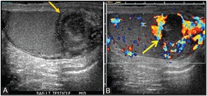 Şekil 2: Testis tümörünün ultrasonografideki görüntüsü. B: Doppler modunda kanlanması artmış tümör görülmekte.